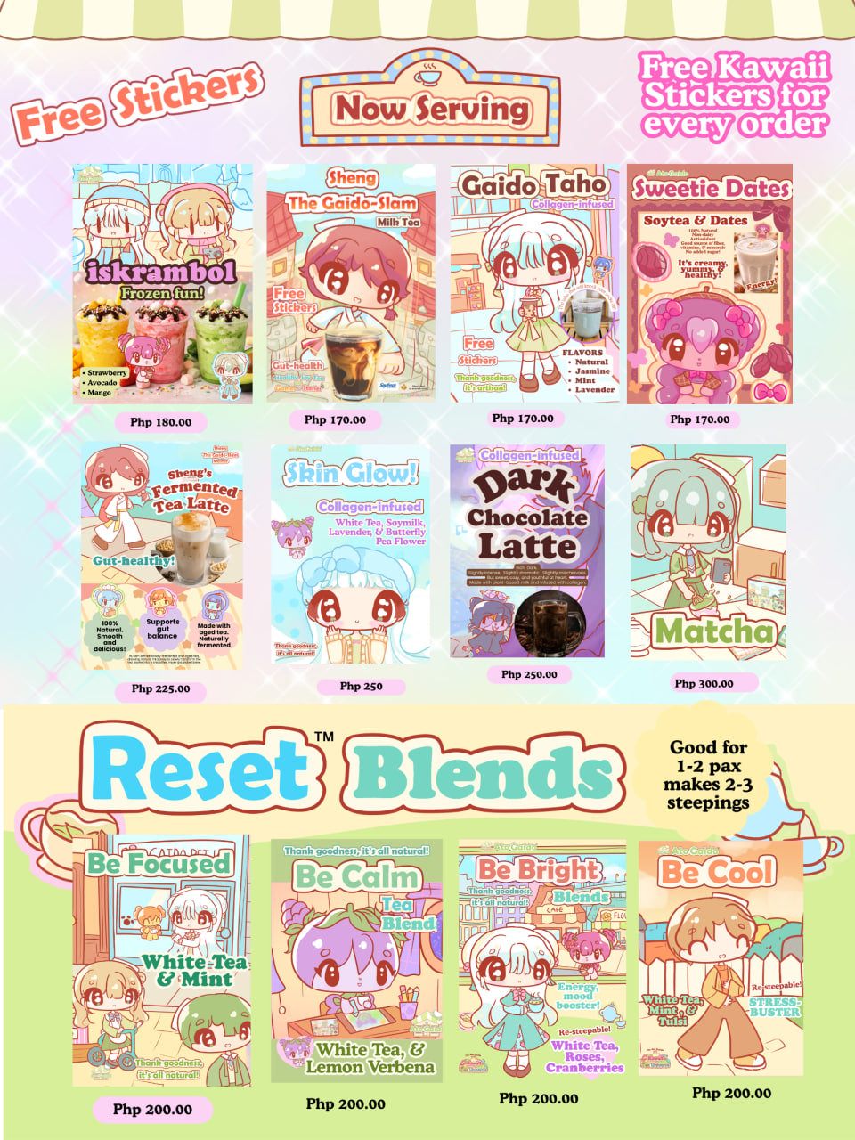 From soothing white tea blends to bold specialty lattes and playful café treats, each item is designed to nourish, comfort, and spark a little joy. And because we love making your day brighter, every purchase comes with a complimentary kawaii sticker — a tiny keepsake from us to you.